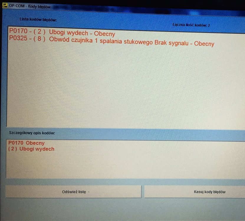 Gość kluczu Opublikowano 9 Grudnia 2018 Udostępnij Opublikowano 9 Grudnia 2018 Wybacz W dniu 9.12.2018 o 18:06, adam1954 napisał: Tak podałeś . Ja tego nie zauważyłem i teraz wrzucam prawidłowy opis błędu P0320 Wybacz, moja pomyłka. Błędy są dwa... 0170 0325 To samo wykrył także OpCom. Wykonałem ze szwagrem diagnostykę na szybko.   Cytuj Odnośnik do komentarza https://forum.opel24.com/topic/85246-silnik-zacz%C4%85%C5%82-traci%C4%87-moc-szarpanie-dziwne-odg%C5%82osy/#findComment-700748 Udostępnij na innych stronach Więcej opcji udostępniania...